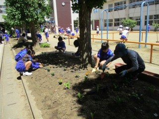 5月8日(木)中庭の花壇に園芸委員会さんがマリーゴールドとキンセンカの苗を植えてくれました。ボランティアで参加してくれた子も植えてくれました。たくさんの苗だったので助かりました。ありがとうございました。