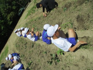 3年生と同じ時間に4年生もサツマイモのつるさしをしました。植えようとした畝にひまわりらしき苗が出ていて、「どうしよう」「そのままにしとこうか」「でも、栄養とられへんかな」と、ひとしきり話題になっていました。