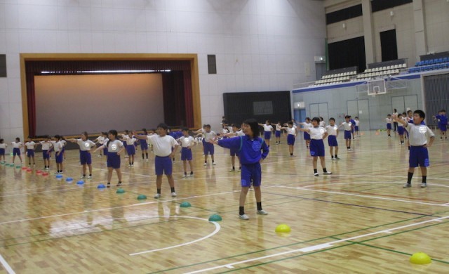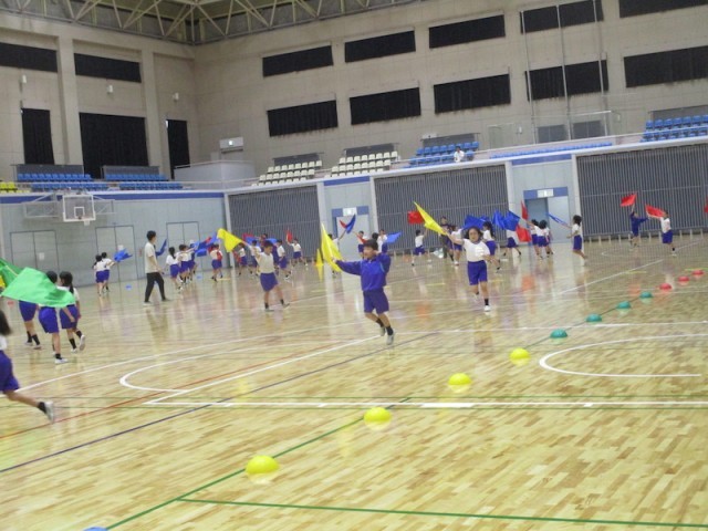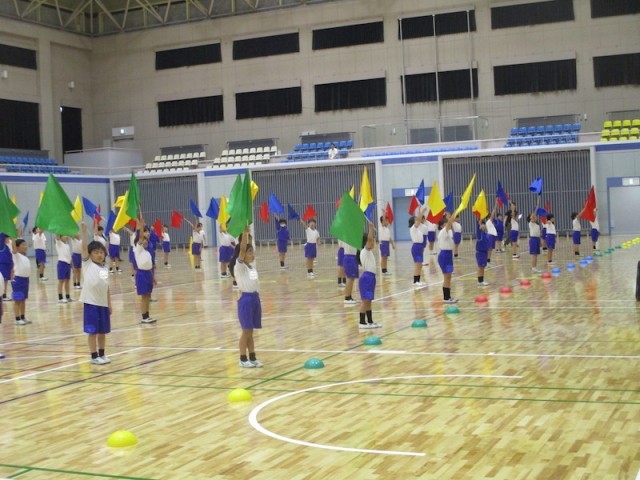 中学年の練習の様子です。総合体育館のきれいな床にフラッグの色が映えています。