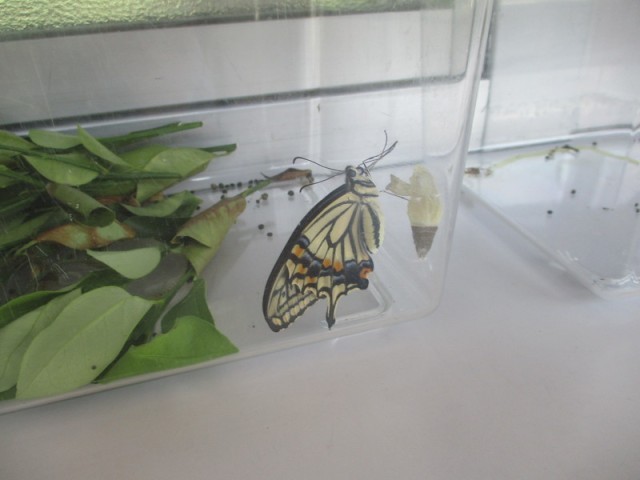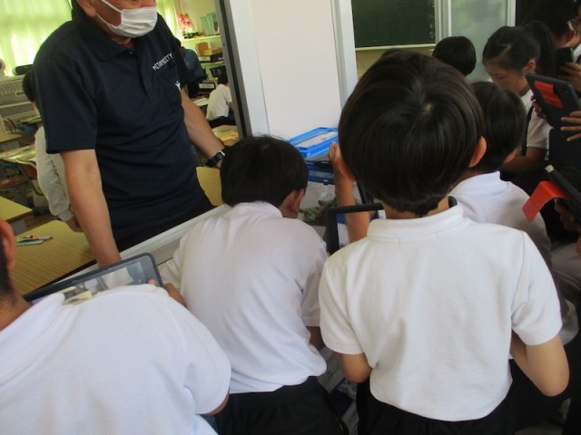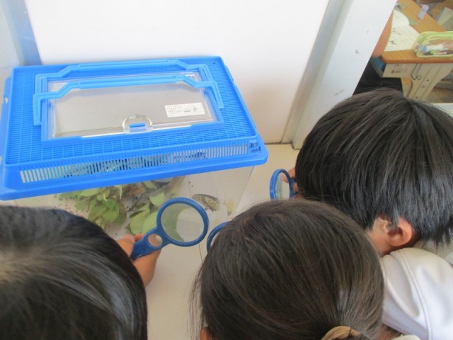 理科で育てていたアゲハチョウが羽化しました。見つけた3年生は大喜びです。タブレットで撮影したり、虫眼鏡で見たりと記録や観察もしっかりとできました。