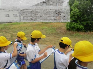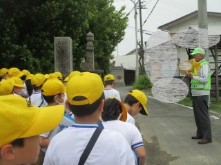 今日は3区に町探検に行きました。上の坊、元村役場(元上高瀬小学校)、落合一角先生の石碑を巡り、伊予街道を歩きました。写真は、元村役場、落合一角先生の石碑、郵便局跡での子どもたちの様子です。