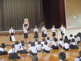 園芸委員会に続いて児童会から、アルミ缶・エコキャップの回収についてのお知らせがありました。今年度も児童会が回収をします。毎週木曜日、7時40分から7時50分までです。ご協力をよろしくお願いいたします。アルミ缶は、洗ってつぶして持たせてください。中に何も入っていないようにお願いします。エコキャップは洗って、シールははがして持たせてください。今年度も社会福祉協議会に車椅子を贈呈しようと、児童会で計画しています。よろしくお願いいたします。