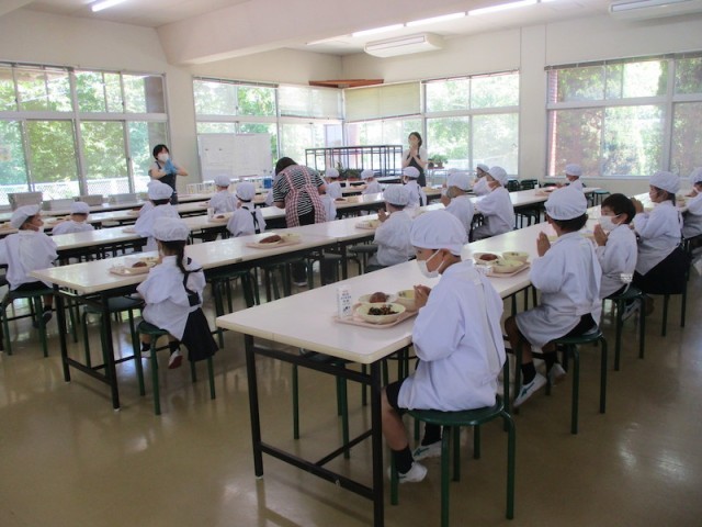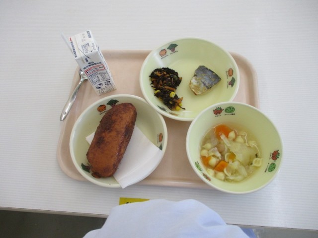 今日の給食の献立は、さわらのガーリック焼き、ポトフ、ひじきのマリネ、牛乳、そして、楽しみに待っていた人も多いであろう「ココア揚げパン」です。口の周りにココアがついてもにっこり笑顔で食べていました。