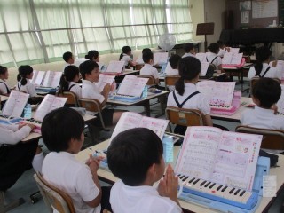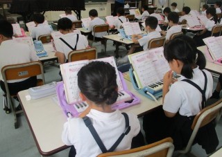 音楽の時間です。「海風きって」という曲を鍵盤ハーモニカのパートと歌のパートで分かれて演奏しています。「明るい声で歌いましょう」というめあてのとおり、明るく、しっかりと声を出して歌っている3年生でした。