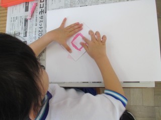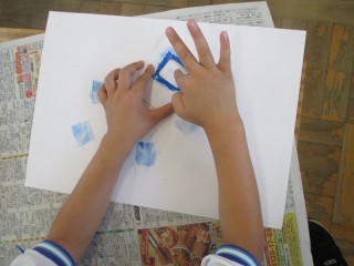 画用紙とクレヨンを使って、あじさいの花をステンシルで表現しています。何といっても、指が大活躍です。