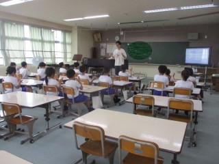 4年2組の音楽の時間です。「楽しいマーチ」という曲で、手拍子によるリズムアンサンブルに挑戦です。手拍子1と手拍子2に分かれて、相手にひきずられないように自分のリズムを打っています。