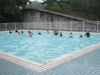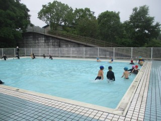 2時間目、プールに入っている1年生です。水にも慣れ、かえるさんやくまさんになって歩いたり、プールの端をぐるぐる歩いて流れを感じたりしていました。途中で少し雨が降ってきましたが、プールには1年生の笑顔がいっぱいでした。