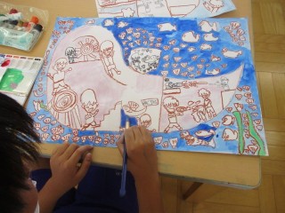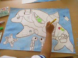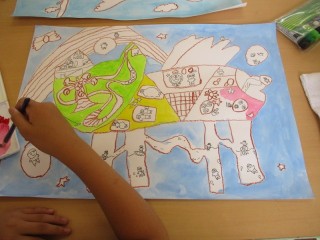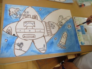 「こんな乗り物に乗ってみたいな」の絵の続きです。乗り物の周りの色塗りが進んでいます。