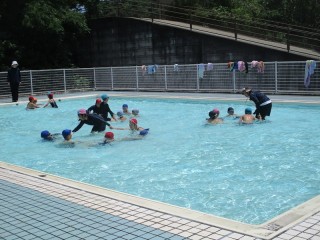 4時間目、2年生のプールでの様子です。色別に手をつなぎ、回っています。題して「うずまき」だそうです。