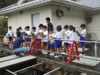 今日は4年生は午前中かけて「水」について学びます。まず始めは、高瀬町上高瀬第1地区処理施設に行き、家庭からの排水を微生物がきれいにしていることを学びました。「この機械は何ですか」など4年生からの質問も出され、関心をもって見学することができました。