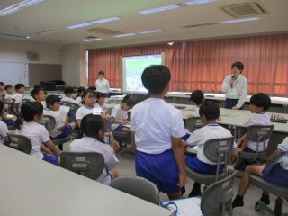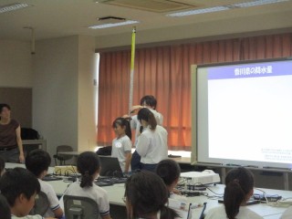 水資源機構 香川用水管理所から3名の方が来てくださり、香川用水について教えてくださいました。地球の水で人が使える水は0.01%しかないことなどから始まり、香川県の水事情や香川用水についてなどとても多くのことを4年生は知ることができました。メモもしっかりととっていたので、最後の4問のクイズも正解することができ、興味関心が高まった4年生は最後の質問タイムには次々と質問をしていました。