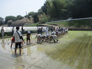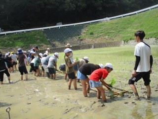 延期になっていた5年生の「田植え」を行うことができました。延期のため、とても暑い中での田植えでしたが、昔ながらの木の定規を使っての手植えをがんばりました。子どもたちの活動時間が短くなるように、お世話してくださっている方があらかじめ機械で植えたり、子どもたちの植える部分をロープで分かりやすく囲ったりしてくださっていました。始めはおそるおそる植えていましたが、だんだんと慣れてきて、木の定規も自分たちで動かしながらどんどん進めていました。終わると、「もっとやりたい。」との声も出ていました。そして最後は、例年のように、PTA会長さんが残ったところを機械で植えてくださいました。お世話してくださっている方、上小ふるさとの会の方々、PTA役員の方々、5年生の保護者の方々、暑い中、ご協力くださり、ありがとうございました。