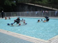 4時間目、2年生のプールでの様子です。色別に手をつなぎ、回っています。題して「う...