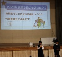 夏に児童会役員が参加した「いじめゼロサミット」で学んだことを、全校生に伝えました。また、「悪口(言葉の暴力)」のこわさについて真剣に考え、全校生がしっかりと耳を傾けました。