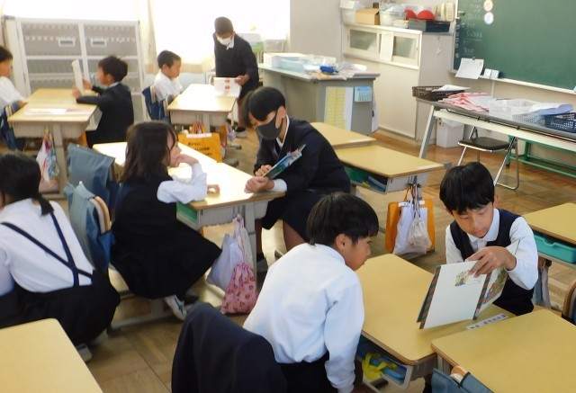 なかよし読書 公開日 2025/10/28 更新日 2025/10/28 学校全体 全校で「なかよし読書」を実施しました。異学年での読み聞かせ活動では、上級生が下級生にやさしく語りかけるように本を読み、下級生は静かに耳を傾けていました。本を通して、読書の楽しさや心のつながりを感じる時間となりました。