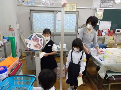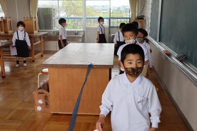 学校探検をしたよ!(1・2年生) 公開日 2022/04/27 更新日 2022/04/27 その他 1・2年生で学校探検に行きました。色別グループに分かれて、2年生が校内を案内してくれました。 校長室に行って記念写真を撮ったり、保健室で養護の合田先生とお話したり、2階や3階にある特別教室を見に行ったりしました。嬉しそうな1年生の姿と、階段や廊下をゆっくり歩いて見守り、道具の使い方を説明している2年生の優しい姿が、とてもほほえましかったです。