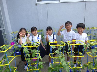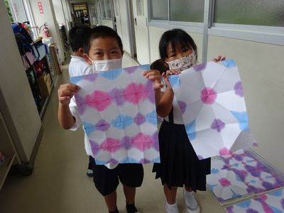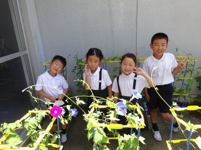 アサガオで色水遊び(1年生) 公開日 2022/07/19 更新日 2022/07/19 1年生 アサガオの花がきれいに咲き、色水遊びをしました。 ピンクやむらさきの色水に、「うわぁ、きれい」と大喜びの子どもたち。奉書紙に色を付けて楽しみました。一人ひとり押し花づくりにも挑戦しています。「上手にできるといいなあ」と、ドキドキしながら作りました。出来上がりが楽しみです。マリーゴールドやホウセンカも咲き始め、学級園が明るくなっています。