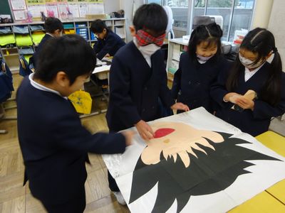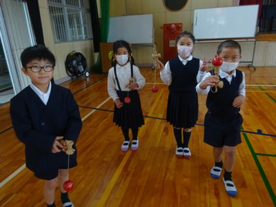 挑戦!むかしのあそび(1年生) 公開日 2023/01/26 更新日 2023/01/26 1年生 生活科で「むかしのあそび」に挑戦しています。 「ふくわらい」「あやとり」「お手玉」「けん玉」「こま」「かるた」「竹うま」「竹とんぼ」など、仲よく楽しみながら活動できています。 初めてする遊びも、おうちの人から教えてもらったコツをみんなに伝えたり、友だち同士で教え合ったり、先生方に教えてもらいに行ったりして、どんどん上手になっています。