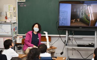 読書の秋・・・テレビを消して、虫の声を聞きながら読書をするのに最適な季節がやってきました。学校でも読書協調週間に向け、読書を勧めています。コロナウイルス対策でストップしていた読み聞かせを、書画カメラを使って再会しました。1年生は、本当に食い入るように絵本を見つめていました。