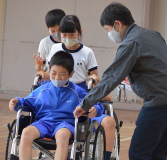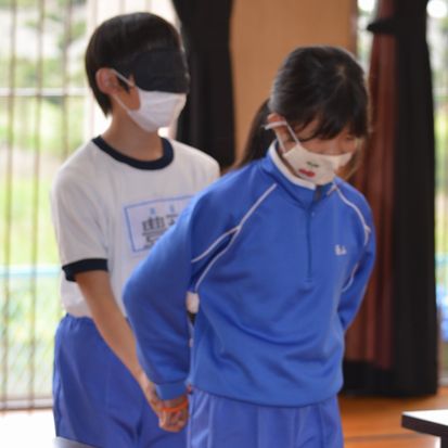 車いす・アイマスク体験を行いました。車いすを押す、目が見えにくい人を誘導するなどの経験は、子どもたちにはほとんどありません。前向きで段差を降りる車いすや、目が見えない状態で手を引っ張るなどの行為は、本当に恐怖しかありません。しかし、正しい支援をしてもらうと、アイマスクをしていても安心して歩けるし、車いすに乗っていても恐怖はありませんでした。今回の体験を生かし、自分が支援することがあれば、相手の気持ちを十分にくみ取って行いましょう。
