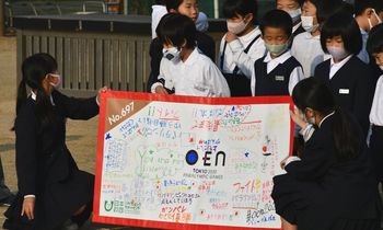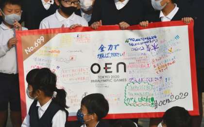 東京パラリンピックへの応援メッセージを描いた「OEN−応援フラッグ」が完成しました。本部に送りますので、パラアスリートに子どもたちのメッセージが直接届きます。ガンバレ‼出場するすべてのパラアスリート。