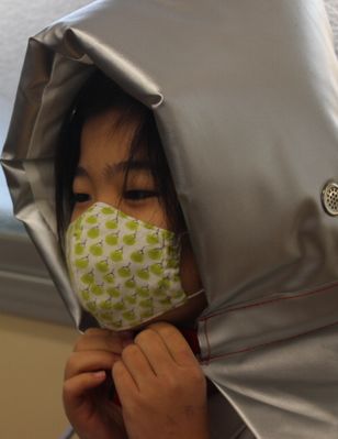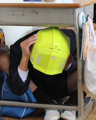 本年度は市より1・2年生には防災頭巾を、3〜6年生には防災ヘルメットを貸与されています。そこで今年のプラスワンは、地震の揺れが収まってから机の下で防災頭巾やヘルメットをかぶることにしました。狭い机の下で防災頭巾をかぶるのは難しかったようです。