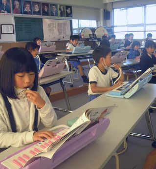 1本の指だけを使っての演奏は、わりと簡単(ゆっくりしたメロディーなら)にできるのですが、指番号に合わせての演奏はなかなか難しいものです。しかし、きちんとした基本がマスターできていないと、曲が複雑になってくると演奏がさらに難しくなってしまいます。2年生は今、その指使いを特訓中です。手の位置もしっかり覚え、全員で『こぎつね』を演奏するのが目標です。