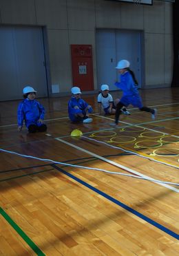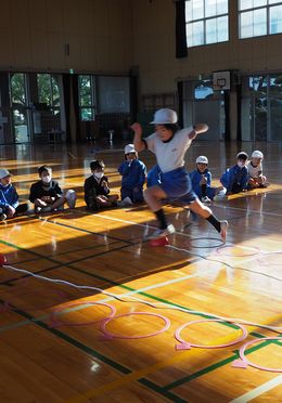 川をイメージし、それを飛び越えるための跳躍練習です。遠くへ飛ぶ経験はあまりない子どもたちでしたが、助走や飛ぶ高さを工夫しながら、見事にワニ川を飛び越えていました。楽しそうに挑戦する子、一生懸命応援する子で、体育館は盛り上がっていました。