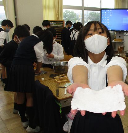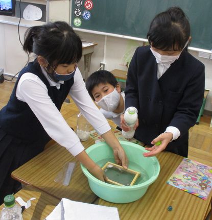 いざ!と意気込んで作業開始。テレビの解説を見た後は、自分たちで試行錯誤しながら紙をすきました。仕上がった紙をうれしそうに眺めていました。何気なく使っていた紙ですが、作るのは本当にたくさんの手間と時間がかかることを実感していました。素晴らしい体験活動でした。