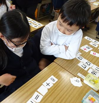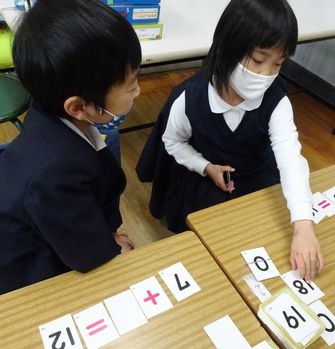 1年生もいろいろな学習の中で、ペア学習に取り組んでいます。「一緒に考えよう」「なるほど!」「すごいね!」など、友だち同士で学び合う機会をもつことで、考えが広がったり深まったりし、意欲的な学習にもつながっています。