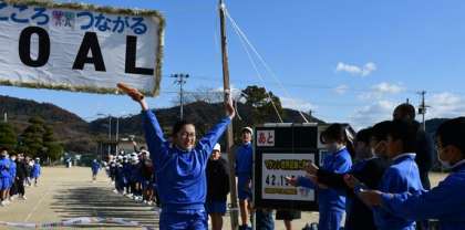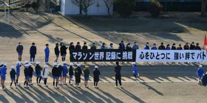 マラソンの世界記録に、全校生と全職員でバトンをつないで挑戦しました。