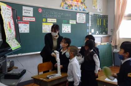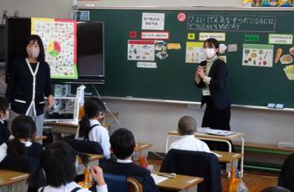 食育指導で栄養教諭の廣田先生に、食べ物の3つの働きについてしえていただきました。