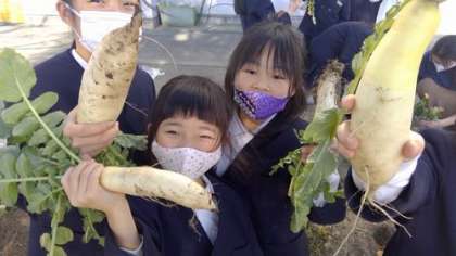 みんなで協力して育ててきた冬野菜のダイコン、ネギ、いよいよ今日収穫です。