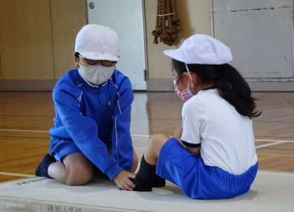 6年生がペアになり、いろいろな種目の測定を行いました。初めて行う種目なので、かなり戸惑いながらの測定ですが、6年生が上手にリードして、楽しく実施できました。反復横跳びのリズムは難しかったようで、一番苦労しているようでした。