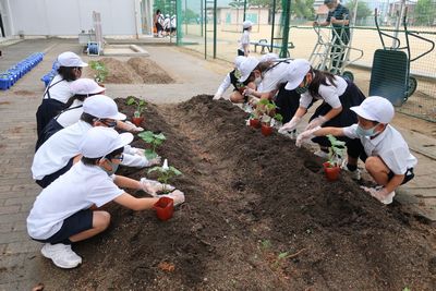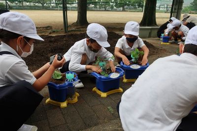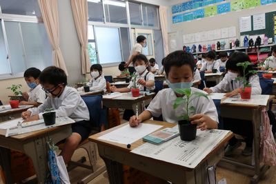 大きく育て(2年生) 公開日 2021/05/19 更新日 2021/05/19 2年生 5月19日(水) 野菜の苗を植えました。 まず、自分で選んだミニトマト、ピーマン、オクラ、えだまめの苗をしっかり観察しました。「わあ!トマトのにおいがする」「はっぱがふわふわ」みんな嬉しそうです。 そのあと、植木鉢に慎重に植えました。他にもキューリ、トウモロコシ、サツマイモも植えました。「早く大きくなってね」・・・・2年生、これからお世話を頑張ります。