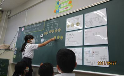 どうすれば暗算でわり算ができるか、今までの学習内容を活用して考えました。グループごとに、その考えをホワイトボードにまとめ、全体に発表しました。既習の内容や具体的なものをあてはめて考えることで、未習のものも理解できる経験をし、また一歩成長したように見えます。また、その伝え方にも工夫を感じました。