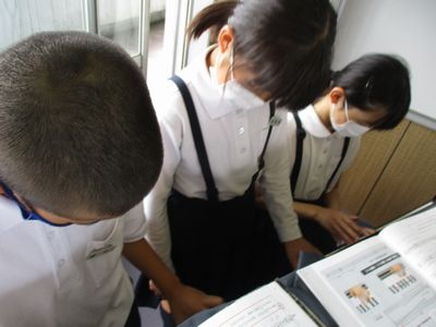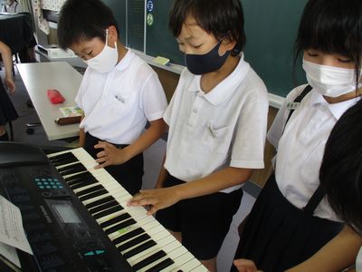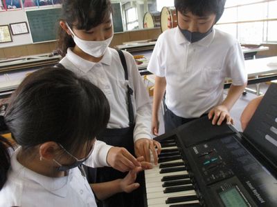 左手での挑戦!・・・・音楽の授業で(5年生) 公開日 2021/06/04 更新日 2021/06/04 5年生 6月4日(金) 「茶色の小瓶」で初めて低音パートを左手で弾くことに挑戦しています。いつもは右手の親指で弾いていた『ド』の音が、1オクターブ低くなって小指で弾くことに!慣れるまでは努力が必要ですが、友だちと教え合って頑張っています。