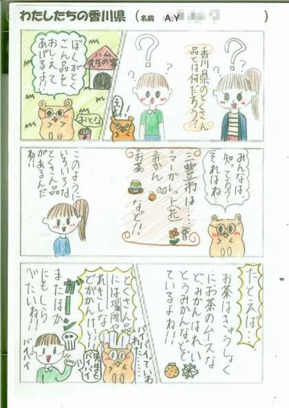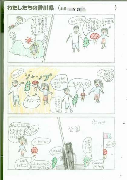 4年生は社会科の授業で、私たちの郷土香川県について学習しました。学習した内容をマンガ形式でまとめました。面白い作品がたくさんあったのですが、その中の2作品を紹介します。