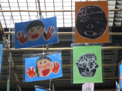 「丸亀市猪熊弦一郎現代美術館 開館30周年記念 NHKかがわ笑顔プロジェクト」に出品した子どもたちの笑顔の絵。1年生は手形を使って、2年生は版画で、それぞれ工夫して図工の時間に作った力作です。駅を行き交う人は、かわいい笑顔の作品を立ち止まって見上げていて、その表情も優しい笑顔でしたよ。