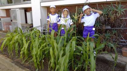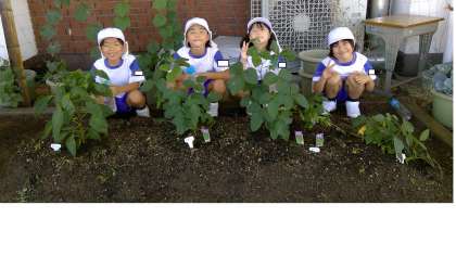 2年生は、生活科「ぐんぐんそだてみんなのやさい」の学習で、自分の好きな野菜を学級園で栽培しています。連休明けに苗を植え、水やりをしたり草抜きをしたり毎日世話をしています。野菜はぐんぐん大きくなり、花や実をつけてきました。収穫をとても楽しみにしています。