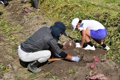 サツマイモ掘りに行ってきました! 公開日 2022/10/17 更新日 2022/10/17 5年生 10月14日に麻公民館、麻環境保全会の方と一緒にサツマイモを収穫しました。1つ1つが大きく成長していたので、とても驚きました。根にデンプンを蓄えていました。収穫したサツマイモを調理して食べるのが楽しみです。