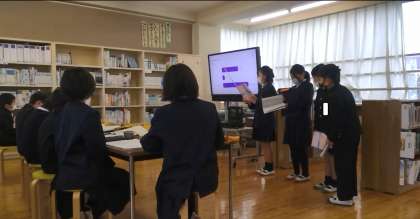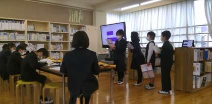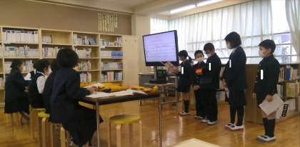 国語の「調べたことをほうこくしよう」という学習で、タブレットでアンケートを作り、様々な学年にアンケートを答えてもらいました。アンケートをタブレットでまとめ、図書館司書の先生に報告をしました。グラフや表を見てもらうときに、間をとったり、声の強弱、話す速さに気をつけていました。