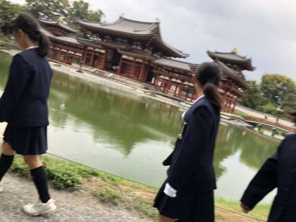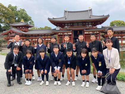 平等院鳳凰堂 公開日 2023/10/20 更新日 2023/10/20 6年生 10月20日金曜日、修学旅行最後の訪れる場所、平等院鳳凰堂に行ってきました。雨に遭うことなく、見学をすることができました。算数の教科書に載っていたり、10円玉の裏に刻印されている平等院鳳凰堂を目の前にして、子どもたちはとても嬉しそうでした。 13名とても元気です。たくさんのお土産話をお楽しみ!