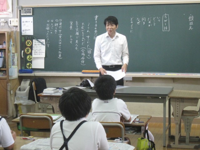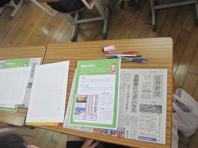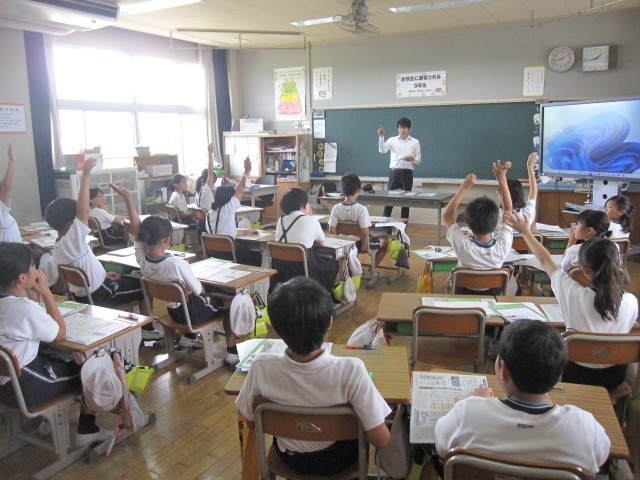5年生は、今国語で新聞記事を読み比べ書き手の工夫について考える学習をしています。今回、ゲストティーチャーとして四国新聞の現役の記者:佐竹さんが来られて、読み手にわかりやすい見出しやリード(全文)の書き方を教えてくださりました。事前に5年生が実際に書いた文章を佐竹さんが一人ひとり読み、添削してくださっていました。内容が同じでも子どもたちが書いた文章と見比べると、プロの書いた文章はさすが読み手を引き付けるなと思いました。子どもたちにとって貴重な経験となりました。