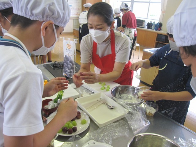 さぬき讃フルーツ広め隊のジュヌヴィエーヴ料理教室の山中さんのご指導でシャインマスカット入りのスイーツづくりに挑戦しました。