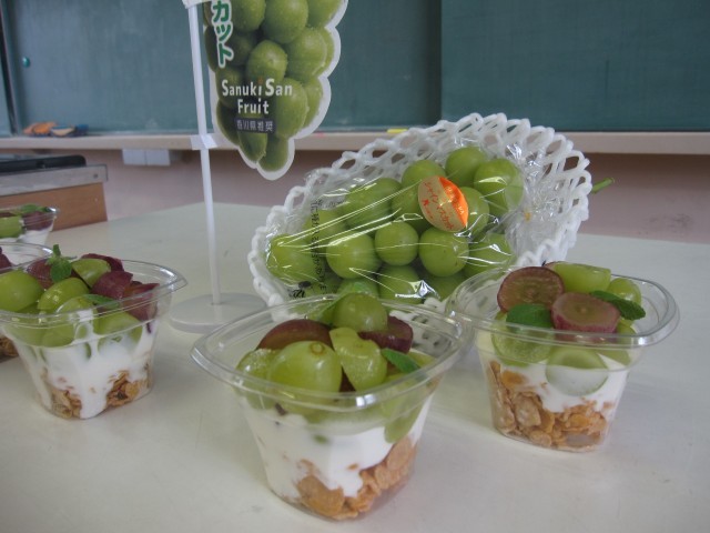 うまいもん出前講座「さぬき讃フルーツ」(シャインマスカット)の第2部は、シャインマスカットの調理・試食です。