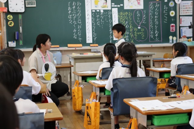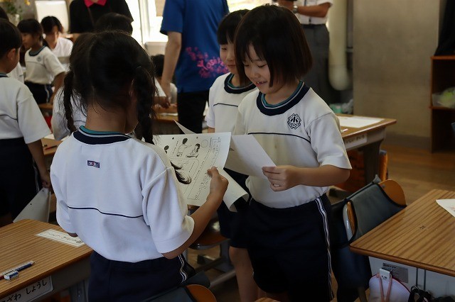 1年生のみなさんは、自分の考えをワークシートに書いたり、みんなが笑顔になる方法を友だちと一緒に考え学び合いを深めていました。