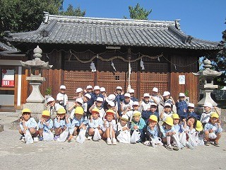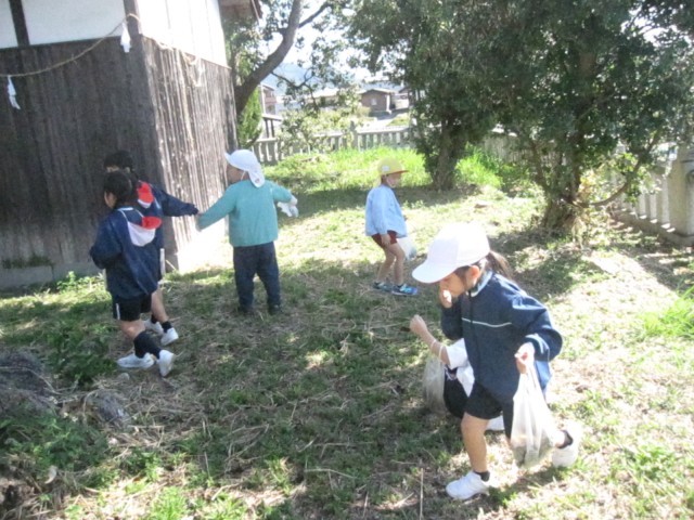 今日、1年生が幼稚園・保育所年長さんといっしょに、秋を見つけに伊予神社へ行きました。
