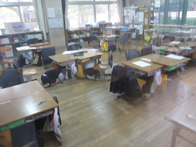 授業中突然地震が来たという想定で自分の身を守る訓練をしました。