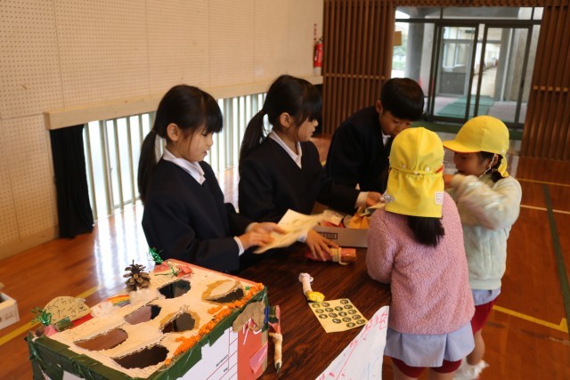 1年生が「おもちゃまつり」に、幼稚園の年長さんを招待しました。最初12月に予定していましたが、インフルエンザの流行の影響で延期していました。あそびは1年生がグループでそれぞれ工夫をこらして考えて制作し、あそびに来た園児たちに上手に説明をしていました。